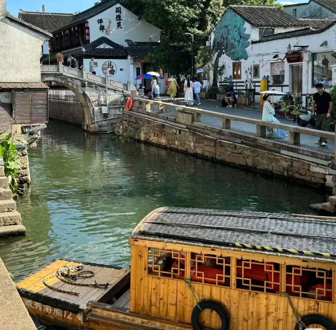 第二天,我们兴致勃勃地前往闻名遐迩的虎丘景区游览踏入虎丘景区,首先映入眼帘的是那座巍峨耸立的虎丘塔,它历经千年风雨,依然屹立不倒,仿佛在诉说着一段段古老而神秘的故事。沿着蜿蜒的小径前行,我们参观了剑池、真娘墓等历史遗迹,每一处都承载着厚重的文化底蕴,让人不禁对古人的智慧与才情心生敬意。在景区内,我们还欣赏到了精彩的吴文化表演,那悠扬的古乐、曼妙的舞姿,将我们带入了一个充满诗意的世界,让人流连忘返。此次虎丘之行,不仅让我们领略了自然风光的秀美,更深刻感受到了中华文化的博大精深。下午,我们漫步于风情独具、古韵悠长的平江路,细细品味着小桥流水与白墙黛瓦交织的江南景致。午后,沿着蜿蜒的河道继续前行,深入体验了原汁原味的江南水乡生活,仿佛置身于一幅宁静而生动的历史画卷中,沉浸在那份独特而迷人的韵味里。沿途,我们偶遇了几位正在河边浣衣的当地居民,他们的笑声与水声交织在一起,构成了一幅温馨和谐的画面。不时还有几只乌篷船悠悠划过,船夫摇橹的姿态娴熟而从容,为这静谧的水乡增添了几分灵动与生机。我们漫步在青石板路上,两旁是各式各样的小店,有的售卖着精美的手工艺品,有的则飘出阵阵诱人的小吃香气,每一处都散发着江南独有的韵味与风情。